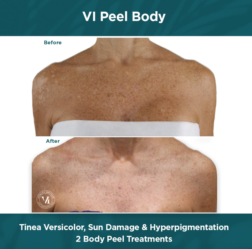 Although most performed on the face, the VI Peel is also effective on the neck, chest, back, arms, and hands. Basically the VI Peel works anywhere you want smoother, clearer, and more youthful skin. - Effectiveness Duration